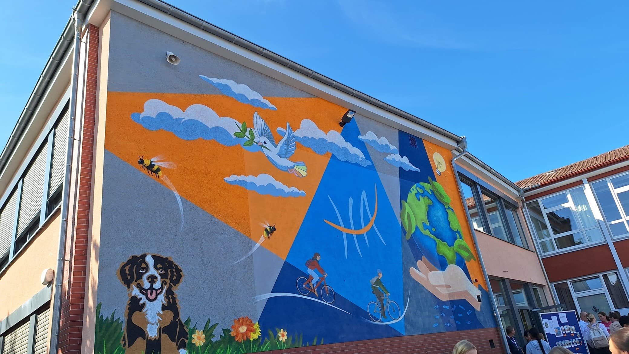 Ein tolles Wandgemälde entstand hier mir viel Liebe zum Detail mit Spraydosen. Auch der Schulhund Ben darf auf der Wand natürlich nicht fehlen.
